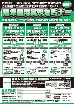 季節労働者を取り巻く状況、就職活動や通年雇用化のためのスキルアップの必要性、法令尊守に関するセミナー。